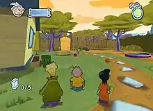 Ed, Edd n Eddy: The Mis-Edventures is a 3D platforming game in which protagonists Ed, Edd, and Eddy are playable characters. Players can use them in special tag team formations like the "(Leaning-)Tower-of-Eddy" (as Eddy), "Trampol-Edd" (as Edd), and "Batter-Ed(-Ram)" (as Ed) to complete eight levels, referred to as scams. The Eds' normal weapons and skills include Ed lifting heavy objects and smashing his head, Edd using a slingshot to hit distant targets and smacking with his ruler in close range, and Eddy using the El Mongo stink bomb to stun enemies,[2] along with using his wallet attached to a chain like a yo-yo.