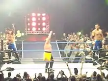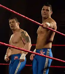 Later that year, in December, Edwards began teaming with fellow Sweet and Sour, Inc member, Davey Richards, as The American Wolves.[7] Their first match as a team was on December 26, at All Star Extravaganza IV, where they lost to The Briscoe Brothers (Jay and Mark) in a three-way elimination tag team match, which also involved Claudio Castagnoli and Nigel McGuinness.[44] The following night at Final Battle 2008, the American Wolves, along with Go Shiozaki, lost to Brent Albright, Roderick Strong, and Erick Stevens in a "New York City Street Fight". Later that night, they attacked and injured Mark Briscoe.[45] As 2009 began, they began challenging for the ROH World Tag Team Championship, losing to the champions Kevin Steen and El Generico on numerous occasions.[46][47] They eventually won the Championship on April 10, at an Ring of Honor Wrestling taping, in a "Tables are Legal" match.[48] Edwards and Richards went on to successfully defend the Championship against teams made up of ROH's top wrestlers including Tyler Black and Bryan Danielson, and against former champions Kevin Steen and El Generico at Manhattan Mayhem III in a submission match.