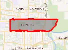 Eden Hill is a northern suburb of Perth, Western Australia, located within the Town of Bassendean. The origin of its name is unknown, either coming from a farm in the area or an estate name used by Henry Brockman when he subdivided the area in 1892. It was approved as a suburb in 1954.[2] The Swan Valley Nyungah Community was in the area.
