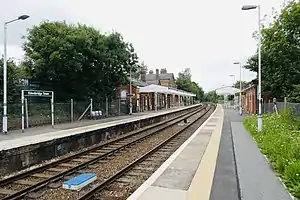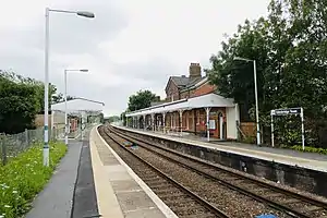 The station has passenger help points and covered seating areas available on both platforms which are linked by a subway. There are also toilets at the station which are open when the station is staffed. The station has a free car park (operated by Saba Parking) and taxi-rank at its main entrance.[1] There is also a cycle rack at the station entrance.