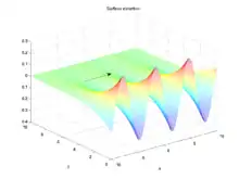 In fluid dynamics, an edge wave is a surface gravity wave fixed by refraction against a rigid boundary, often a shoaling beach. Progressive edge waves travel along this boundary, varying sinusoidally along it and diminishing exponentially in the offshore direction.[1]