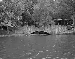 The Edgemere Street Bridge is a historic bridge in North Little Rock, Arkansas. It carries Edgemere Street over a small part of Lakewood Lake Number Three. It is a masonry structure with closed spandrels, and has a span of about 18 feet (5.5 m) and a total length of 57 feet (17 m). It is built out of rustic, roughly squared fieldstone, that is laid in uncoursed fashion. Vertical columns project from either side of the spandrels, rising above the deck level to form a decorative parapet. It was built, along with the similar Lakeshore Drive Bridge as part of the innovative Lakewood Development project of developer Justin Matthews in the 1930s.[2]