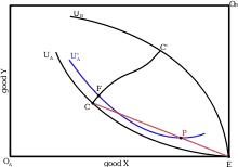 Suppose a single extra pair of identical traders is added to this initial pair. As these new traders are identical to the first pair, the same Edgeworth box can be used to analyse the exchange. To examine the new outer limits of the trade, Edgeworth considered the situation where trade occurs at the limit of trade between two people (point C or C' in Figure 2). If trade were to occur at point C one of the B's (say B(1)) would receive all the gains from trade. The one A who trades with B(1) (say A(1)) now has a mix of goods X and Y which he is able to trade with A(2). As the two A's are identical, they will agree to split their post-trade endowments equally between them, placing them at point P in Figure 2 which gives them a higher utility than they would otherwise receive (indifference curve U'(a) instead of U(a)). B(2) now has an opportunity and strong incentive to offer the A's a better price for their goods and trade with them at this price, leaving B(1) out in the cold. This process of B's competing against one another to offer the A's a better price will continue until the A's are indifferent between trading at P and trading on the contract curve (Figure 3). The same reasoning can be applied to the case where A(1) initially receives all the gains from trade, and it can be shown that the outermost limit given by U(b) will also move inwards. This is called the shrinking core of the market - as an extra pair of traders is added, the feasible range of trades shrinks.