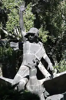 In 1972 Metrópolis Seguros acquired the building, and the previous owner decided to take the original statue away with them, by then very familiar in Madrid's skyline, to their new headquarters. This original statue that used to be on top of the building, depicted the mythological Phoenix and Ganymede sitting on its wing. It is currently on display in the gardens around the Mutua Madrileña building, Paseo de la Castellana nr 33.