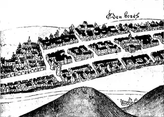 By the 17th century the King's Wall had been almost completely absorbed within later buildings, although it is briefly mentioned in the "Extent Roll", a town survey of 1635, and limited sections appear on James Gordon of Rothiemay's map of 1647.[31] The mason John Mylne and the wright (carpenter) John Scott strengthened the Flodden and Telfer walls and constructed artillery emplacements in 1650.[2] This was due to fear of an English attack on Edinburgh during the English Civil War (nearby Dunbar having been attacked). The quickly made changes included taking the four ornamental tops off the Netherbow Port, in order to install cannon.[32]