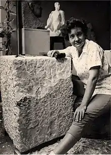Grøn sculpted in clay, stone and wood,[2] and molded in concrete and various metals. Her initial works were realistic and she strove for perfection, but she was influenced by the Romanian modernist Constantin Brâncuși, which led her to shift to more stylized forms.[1][5] In 1960, she completed a statue of General José Dolores Estrada for the Nicaraguan Association of Writers and Artists.[8] She was known for her sculptures of Rubén Darío, and also depicted personalities such as Josefa Toledo de Aguerri, Pablo Antonio Cuadra, among others.[2] A 1958 sculpture of Darío was installed in a Miami, Florida park in 1961.[9] That same year, Grøn carved a stone head of Darío clothed in a Carthusian habit, titling it La Cartuja, in reference to the poet's 1913 work on the same theme.[2] In 1962 to commemorate the 350th anniversary of the indigenous revolt against the Spanish conquistador Gil González Dávila, Grøn sculpted an image of Cacique Diriangén to depict his courage and resistance. In 1964, she sculpted a bust of Darío from white Guatemalan marble, which has become an iconic image of the poet.[1] In the 1970s, Grøn developed mouth cancer and went to the MD Anderson Cancer Center in Houston for chemotherapy. She began losing her sight in 1981 and was forced to change to painting and inlay works with wood.[2] Some of her most known paintings include: Muchacha en la hamaca (Girl in a hammock), Cándida, Desnudo (The nude), and Llanto después del desastre (Tears after the disaster), which was a reference to the 1972 Nicaraguan earthquake.[1]