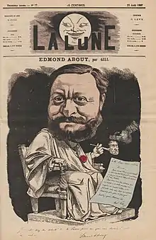 About was born at Dieuze, in the Moselle département in the Lorraine region of France.[1] In 1848 he entered the École Normale, taking second place in the annual competition for admission in which Hippolyte Taine came first. Among his college contemporaries, besides Taine, were Francisque Sarcey, Challemel-Lacour and Prevost-Paradol. Of them all, About was considered the most highly vitalized, exuberant, brilliant and "undisciplined".[2] It is said that one of his schoolmasters told him "You will never be more than a little Voltaire,"[3] and About's career did tend toward Voltaire-style witty satire and commentaries on contemporary issues.