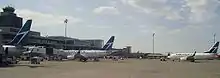 Edmonton International Airport provides scheduled non-stop flights to 55 destinations.[28] It serves as the hub for Flair Airlines.[29] Edmonton is also the western hub for Swoop, becoming the largest hub for Swoop in the winter, flying 51 departures weekly during the season.[30] Edmonton is one of WestJet's largest focus cities; the airline flies to 30 destinations with an average of 62 daily departures, nonstop, from Edmonton. WestJet (and its subsidiaries) are the largest carriers at Edmonton International Airport, holding more than 70% of the market share.[31][32][33]