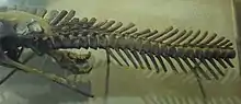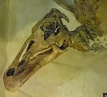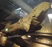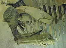 The Edmontosaurus mummy SMF R 4036 is an exceptionally well-preserved dinosaur fossil in the collection of the Naturmuseum Senckenberg (SM) in Frankfurt am Main, Germany. Found in 1910 in Wyoming, United States, it is ascribed to the species Edmontosaurus annectens (originally Trachodon), a member of the Hadrosauridae ("duckbilled dinosaur"). The fossil comprises a nearly complete skeleton that was found wrapped in impressions of its skin, a rare case of exceptional preservation for which the term "dinosaur mummy" has been used.[1] Notably, the horny beak is preserved with this specimen. Plant remains found within the thorax cavity had been interpreted as stomach contents, although later research questioned this identification. The mummy's hands are wrapped in skin impression, which was interpreted as evidence for interdigital webbing and an aquatic lifestyle in hadrosaurids; this hypothesis, although universally accepted once, is now widely refused. SMF R 4036 is one of the four best preserved hadrosaurid mummies, and was the second to be discovered.[2] The find was made by fossil hunter Charles Hazelius Sternberg and his sons, who sold their numerous finds to various museums in North America and Europe. Only two years earlier the Sternbergs had discovered the Edmontosaurus mummy AMNH 5060 in the same region, which is now on display at the American Museum of Natural History (AMNH) in New York.