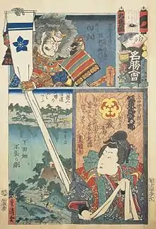 An entertaining feature of the Edo-no-Hana Meisho-e prints is the use of double meanings, which often relate to place names, within the text that accompanies many of the famous landscape scenes.[6] It is also notable that puns and dual interpretations can be found in some of the signed alternate names used by the artists and within the title of the series itself. The Flowers of Edo was not only a metaphor for the finest aspects of the day but also a colloquial expression, used to describe the fires that often threatened an urban Edo environment constructed predominantly of wood and paper.[7] The reference to the constant threat of flames in the city is also reinforced in each of the prints, by the display of the troop name, number and emblem of the firemen responsible for protecting the relevant Edo district pictured.[6] Moreover, as fire-fighters were admired as great examples of enthusiasm and bravery, they were likely considered as much a Flower of Edo as any popular Kabuki actor or fashionable Ukiyo-e print artist of the period.