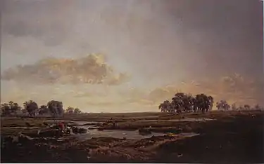 Unlike most of his peers, he preferred to paint wide open, sometimes monotonous plains, with clouds and perhaps one lonely tree. His favorite spots were in the Kempen (including Genk, the site of another artists' colony), the polders on the Scheldt, in Hainaut, and in the Meuse valley, near Anseremme, where he became involved with yet another artists' colony.