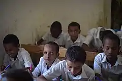 Following the outbreak of the Somali Civil War in 1991, the task of running schools in Somalia was initially taken up by community education committees established in 94% of the local schools.[7] Numerous problems had arisen with regard to access to education in rural areas and along gender lines, quality of educational provisions, responsiveness of school curricula, educational standards and controls, management and planning capacity, and financing. To address these concerns, the Puntland government is in the process of developing an educational policy to guide the region's scholastic process as it embarks on the path of reconstruction and economic development. The latter includes a gender sensitive national education policy compliant with world standards, such as those outlined in the Convention on the Rights of the Child (CRC) and the Convention on the Elimination of All Forms of Discrimination against Women (CEDAW).[8] Examples of this and other educational measures at work are the government's enactment of legislation aimed at securing the educational interests of girls,[9] promoting the growth of an Early Childhood Development (ECD) program designed to reach parents and care-givers in their homes as well as in the ECD centers for 0-5-year-old children,[10] and introducing incentive packages to encourage teachers to work in remote rural areas.[11]