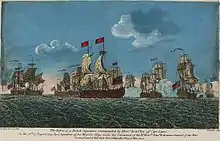 In 1747 Boscawen was ordered to join Admiral Anson and took an active part in the first Battle of Cape Finisterre.[15]: 290 [4]: 186 The British fleet sighted the French fleet on 3 May. The French fleet under Admiral de la Jonquière was convoying its merchant fleet to France and the British attacked. The French fleet was almost completely annihilated with all but two of the escorts taken and six merchantmen. Boscawen was injured in the shoulder during the battle by a musket ball.[15]: 291 Once more the French captain, M. de Hocquart became Boscawen's prisoner and was taken to England.[16]