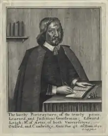 Knighted in 1632 being of Staffordshire landed gentry, he was later noted for his anti-Catholicism. At the outbreak of civil war, Leigh upon being appointed colonel in the Parliamentary Army preferred not to be styled Sir. On 30 September 1644 he presented to parliament a petition from Staffordshire Parliamentarians complaining of Cavalier oppression, and made a speech which was printed. In 1645 he was elected Member of Parliament for Stafford in the Long Parliament to replace those MPs who had been declared 'disabled to sit'.[2] His theological attainments procured him a seat at the Westminster Assembly. His signature is affixed to the letter written in the name of the Parliamentary Committee which granted powers to the Visitors of the University of Oxford in 1647. Having in December 1648 voted that the King's concessions were satisfactory, Sir Edward was expelled from the House under Pride's Purge. From then he appears to have avoided public life.