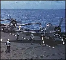 Equipped with the highly successful follow-on to the Wildcat, the new Grumman F6F-3 Hellcat, two-thirds of VF-6 (twenty-four F6F-3s) under O'Hare's command embarked on August 22, 1943, on the light carrier USS Independence.[30] The arrival of the F6Fs with their powerful Pratt & Whitney R-2800 radial engines in late 1943 combined with the deployment of the new Essex-class carriers and the Independence-class carriers immediately gave the U.S. Pacific Fleet air supremacy wherever the Fast Carrier Force operated. The Hellcat's first combat mission occurred on August 31, 1943, in a strike against Marcus Island. The F6F did well against Japanese fighters and proved that with the right tactics and teamwork the Japanese Zero need not be considered a superior enemy. VF-6's combat debut on the Independence also went reasonably well. For his actions in battles near Marcus Island on August 31, 1943, O'Hare was awarded the Distinguished Flying Cross.[31] For his actions in subsequent missions near Wake Island on October 5, 1943, O'Hare was awarded a Gold Star in lieu of a second Distinguished Flying Cross.[32]