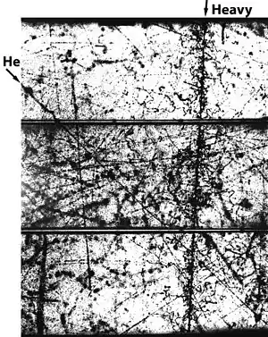 In ordinary matter, atoms of these elements consist of a nucleus surrounded by a cloud of electrons, but when the nuclei arrive as cosmic rays, they are devoid of electrons, because of collisions with atoms in interstellar matter. In both emulsions and cloud chambers, these "stripped" heavy nuclei leave an unmistakable track, which is much denser and "hairier" than that of protons, and whose characteristics make it possible to determine their atomic number. In further flights, the group showed that the abundances of elements in cosmic rays are similar to those found on earth and in stars.[14] These results had a major impact, for they showed that studies of cosmic radiation could play a significant role in astrophysics.
