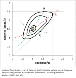 Since multiple distinct gait parameters have a significant impact on the energetic cost of walking, each of these parameters have to be considered when examining the primary goal of metabolic cost optimization. The visualization of such an optimization for walking speed, cadence, and step length can be expressed in the form of a contour map, in which parameter combinations that lie on the same contour line share the same cost of transport (cal/kg/m).[2][22] The green, red, and blue, dotted lines represent values where cadence, walking speed, and step length are constrained, respectively. These lines can be formed by finding the tangent points that lines representative of several constant parameter values form with the constant COT contours. For example, the optimal COT's for constrained walking speeds (red) can be found by drawing vertical lines and noting where they form a tangent with a contour, as seen with point B in the diagram. A series of these intersections can then form the curve for optimal COT under constrained walking speed. These constrained optimization values not only reflect the naturally selected preferred gait parameters that are observed by fixing a single parameter at different values, but also form part of a predictive map that allows for the identification of the cost of transport for a multivariate system.