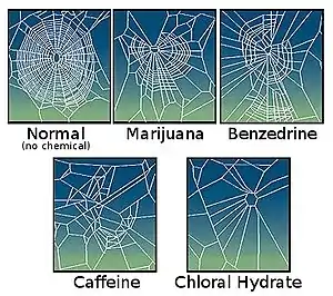 In 1948, Swiss pharmacologist Peter N. Witt started his research on the effect of drugs on spiders. The initial motivation for the study was a request from his colleague, zoologist H. M. Peters, to shift the time when garden spiders build their webs from between 2 a.m. and 5 a.m., which apparently annoyed Peters, to earlier hours.[4] Witt tested spiders with a range of psychoactive drugs, including amphetamine, mescaline, strychnine, LSD, and caffeine, and found that the drugs affect the size and shape of the web rather than the time when it is built. At small doses of caffeine (10 µg/spider), the webs were smaller; the radii were uneven, but the regularity of the circles was unaffected. At higher doses (100 µg/spider), the shape changed more, and the web design became irregular. All the drugs tested reduced web regularity except for small doses (0.1–0.3 µg) of LSD, which increased web regularity.[2]