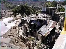 High water levels along the Choluteca River affected the capital, Tegucigalpa,[6] reaching levels 10 m (33 ft) above their banks.[5] Mitch largely destroyed the center of the city, including many residential buildings along river banks.[7] The floods damaged about one-third of buildings, including some more than 350 years old.[8] The storm destroyed the primary water mains in Tegucigalpa and neighboring Comayagüela, and 23 km (14 mi) of water piping had to be repaired.[7] In central Tegucigalpa, there was a large earthflow along Cerro El Berrinche mountain that weighed 6,000,000 m3 (210,000,000 cu ft). This landslide, the largest generated by Mitch in the country, destroyed the Colonia Soto section and damaged portions of two other neighborhoods.[9] It carried debris, trees, and rocks, forming a temporary dam along the Choluteca River laden with sewage.[5][9] Because the landslide was slow-moving, officials were able to evacuate before the river was stopped due to the temporary dam. Another smaller landslide destroyed several houses in the Colonia El Reparto section of the capital, although it was also slow-moving, and the residents were able to evacuate. Other landslides destroyed over 20 houses along the rivers in the city due to erosion along river banks.[9]
