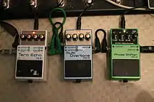 Common effects include distortion/overdrive, often used with electric guitar in electric blues and rock music; dynamic effects such as volume pedals and compressors, which affect loudness; filters such as wah-wah pedals and graphic equalizers, which modify frequency ranges; modulation effects, such as chorus, flangers and phasers; pitch effects such as pitch shifters; and time effects, such as reverb and delay, which create echoing sounds and emulate the sound of different spaces.[1][2]