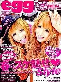 Egg was a style magazine for gyaru fashion, distributed in Japan. It featured photos of ganguro girls and synopses of their tastes and popular trends. The magazine also usually had photos of the newest fashions, where to buy them, latest hairstyles, cell phones, and make up tips. It also had candid photos of ganguro girls on the streets of Japan, similar to Fruits magazine. Egg had its own models which starred in every magazine. Due to the decline of Gyaru popularity, the magazine shut down with the last issue on 31 May 2014.[2]