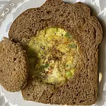 The dish consists of a slice of bread with an egg in the middle, fried with butter or oil.[1][2][3] It is commonly prepared by cutting a circular or square hole in the center of a piece of bread, which may be buttered. The bread is fried in a pan with butter, margarine, cooking oil, or other fat. At some point, an egg is cracked into the hole in the bread. When the egg is added to the bread determines how well-done the egg and bread will be relative to each other in the final product. The pan may be covered and the bread flipped while on the heat to obtain even cooking. A waffle or bagel (with a large enough hole) can also be substituted for the slice of bread.[4][5]