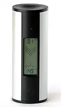 One such product is made of translucent plastic with a heat-sensitive coloured disc in the middle which changes colour at 80 °C (176 °F). The plastic around the disc changes temperature relatively steadily and gradually from the outside to the inside of the plastic mimicking how an egg heats up while cooking. This allows an observer to see the colour creep inwards through the disc and stop the boiling at the stage required. As it mimics the boiling of an egg, it will be accurate even if the boiling process is disrupted, a lower temperature is used and regardless of the quantity of eggs being cooked.[2] Other similar products use electronics to sense the water temperature and play a certain tune or series of beeps to indicate the state of the eggs.[3]