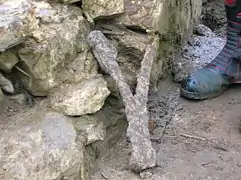 The lower courses of ashlar[29] on the bridge abutments and central pier were vermiculate.[30] At some point the height of the weir beneath had been raised using an odd assortment of re-used stonework; this would have increased the depth and extent of the waters behind it. The central pier and the original weir had used reworked but re-cycled stone, probably from Kilwinning Abbey; as illustrated by a stone window surround recovered during restoration work (See illustration).