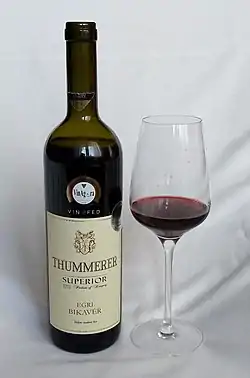 Egri Bikavér (Bull's Blood of Eger) is a blended red wine produced in Eger, Hungary. It is very representative of the red wines of Eger, a terroir wine, which carries the flavour of the soils of local production sites, the mezzo-climate unique to the region and the traditions and mores of local residents, from the selection of varieties to choosing the period and method of grape processing and mellowing.