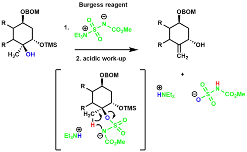 The dehydration of secondary and tertiary alcohols to yield an olefin through a sulfamate ester intermediate is called the Burgess dehydration reaction.[13][14][15] The reaction conditions used are typically very mild, giving it some advantage over other dehydration methods for sensitive substrates. This reaction was used during the first total synthesis of taxol to install an exo-methylene group on the C ring.[16]