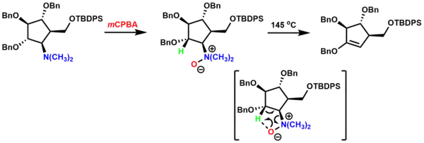 The Cope elimination (Cope reaction) is the elimination of a tertiary amine oxide to yield an alkene and a hydroxylamine through an Ei mechanism.[13][21] The Cope elimination was used in the synthesis of a mannopyranosylamine mimic.[22] The tertiary amine was oxidized to the amine oxide using m-chloroperoxybenzoic acid (mCPBA) and subjected to high temperatures for thermal syn elimination of the β-hydrogen and amine oxide through a cyclic transition state, yielding the alkene. It is worth noting that the indicated hydrogen (in green) is the only hydrogen available for syn elimination.