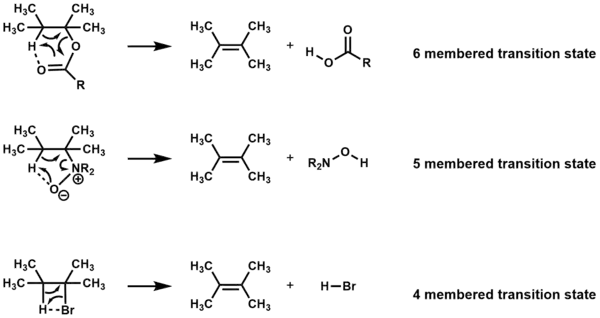 Compounds that undergo elimination through cyclic transition states upon heating, with no other reagents present, are given the designation as Ei reactions. Depending on the compound, elimination takes place through a four, five, or six-membered transition state.[1][2]