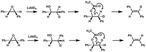 Isotopic labeling was used to confirm that syn elimination occurs during ester pyrolysis in the formation of stilbene.[9]