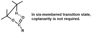 The elimination must be syn and the atoms coplanar for four and five-membered transition states,[3] but coplanarity is not required for six-membered transition states.[1]