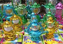 Eid al-Fitr has a particular salat (Islamic prayer) that consists of two rakats (units) generally performed in an open field or large hall. It may only be performed in congregation (jamāʿat) and features six additional Takbirs (raising of the hands to the ears while saying "Allāhu ʾAkbar", meaning "God is the greatest") in the Hanafi school of Sunni Islam: three at the start of the first rakat and three just before rukūʿ in the second rakat.[6] Other Sunni schools usually have 12 Takbirs, similarly split in groups of seven and five. In Shia Islam, the salat has six Takbirs in the first rakat at the end of qira'a, before rukūʿ, and five in the second.[7] Depending on the juristic opinion of the locality, this salat is either farḍ (فرض, obligatory), mustaḥabb (strongly recommended) or mandūb (مندوب, preferable). After the salat, Muslims celebrate the Eid al-Fitr in various ways[8] with food ("Eid cuisine") being a central theme, which also gives the holiday the nickname "Sweet Eid" or "Sugar Feast".[9][10]