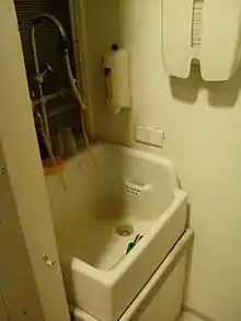 Einstein's Sink is an antique sink that has been in use by the physics faculty of Leiden University since 1920. Originally the sink stood in the large lecture room of the old Kamerlingh Onnes Laboratory. It was taken to the new building when the physicists moved to the Leiden Bioscience park in 1977. Here it still stands in the current large lecture room (The De Sitterzaal of the J.H. Oortgebouw), continuing the tradition of washing the hands of visiting famous scientists.[1] A short list of 'sink users' consists out of Paul Ehrenfest, Heike Kamerlingh Onnes, Hendrik Antoon Lorentz and Albert Einstein.[2] But also more recently nobel prize winners like Brian Schmidt and Albert Fert.