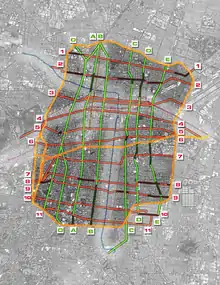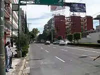 The system of Ejes viales (singular: eje vial, lit. "road axis") in Mexico City is a large network of wide arterial roads with coordinated traffic signals. They are mainly directed in one-way with a single lane going in the opposite direction used exclusively by public transportation. The network was a project of Mexico City mayor Carlos Hank González and the first part of the network, after extensive construction and demolition of buildings and removal of trees, opened in 1979.[1] With the exception of the Eje Central, a south-to-north eje passing through the Historic center of Mexico City, the ejes are numbered with cardinal directions, for example going north from the center: Eje 1 Norte, then Eje 2 Norte, and so forth. In addition to the Eje number and directional, the streets retain their individual names, with one eje thus consisting of multiple sequential individually named streets.