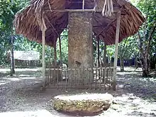 The West Structure contained a 1.2-metre (3.9 ft) wide room accessed via a 0.7-metre (2.3 ft) wide doorway.[55] The rear room of the structure contained a bench, or throne, that measured 2.4 by 2.95 metres (7.9 by 9.7 ft) and stood 0.45 metres (1.5 ft) high.[55] Material recovered from the structure has been dated to the Late and Terminal Classic Periods, with a small amount dating to the Postclassic.[56]