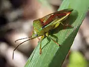The birch shieldbug (Elasmostethus interstinctus)[2] is species of shield bug in the Acanthosomatidae family. Shield bugs are often called "stink bugs" because they excrete a foul smelling liquid that is used to deter predators.