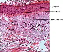 Elastosis is the buildup of elastin in tissues, and is a form of degenerative disease.[7] There are a multitude of causes, but the most commons cause is actinic elastosis of the skin, also known as solar elastosis, which is caused by prolonged and excessive sun exposure, a process known as photoaging. Uncommon causes of skin elastosis include elastosis perforans serpiginosa, perforating calcific elastosis and linear focal elastosis.[7]