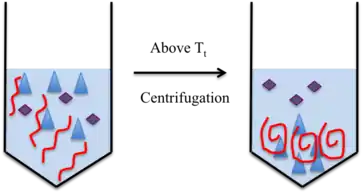 The ELP can be conjugated to a functional group that can bind to a protein of interest. At temperatures below the Tt, the ELP will bind to the ligand in its linear form. In this linear state, the ELP-protein complex cannot easily be distinguished from the extraneous proteins in the solution. However, once the solution is heated to a temperature exceeding the Tt, the ELP will form spherical clumps. These clumps will then settle to the bottom of the solution tube following centrifugation, carrying the protein of interest. The proteins that are not needed will be found in the supernatant, which can be physically separated from the spherical aggregates. To ensure that there are few impurities in the ELP-protein complex isolated, the solution can be cooled below the Tt, enabling the ELPs to once again assume their linear structure. From this point, hot and cold centrifugation cycles can be repeated, and then the protein of interest can be eluted from the ELPs via the addition of a salt.[3]