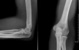There are three bones at the elbow joint, and any combination of these bones may be involved in a fracture of the elbow. Patients who are able to fully extend their arm at the elbow are unlikely to have a fracture (98% certainty) and an X-ray is not required as long as an olecranon fracture is ruled out.[23] Acute fractures may not be easily visible on X-ray.