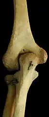 The elbow is the region between the arm and the forearm that surrounds the elbow joint.[1] The elbow includes prominent landmarks such as the olecranon, the cubital fossa, and the lateral and the medial epicondyles of the humerus. The elbow joint is a hinge joint between the arm and the forearm;[2] more specifically between the humerus in the upper arm and the radius and ulna in the forearm which allows the forearm and hand to be moved towards and away from the body.[3][4] The term elbow is specifically used for humans and other primates, and in other vertebrates forelimb plus joint is used.[1]