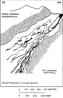 Eldorado Mining and Refining opened the Beaverlodge Mine in 1953.[9] The Eldorado Company's major production came from the Fay-Ace-Verna mine shafts, mostly from uranium deposits located in the Archaen Tazin Group.[7] The deposits are found within the footwall and hanging wall of the St. Louis fault.[7][10]