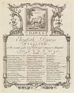 Although guilds had been formed around specific trades, by the eighteenth century many of the London guilds, known as Livery Companies, no longer had monopoly control of their indicated trades.[7] Only a few companies by this time specified the actual trade to be practiced by its members, so members of the company could practice a trade completely unrelated to the named trade of the company.[8] In order to run a business and trade within the walls of the City of London, membership in one of the companies was required for both men (known as masters) and women (known as mistresses).