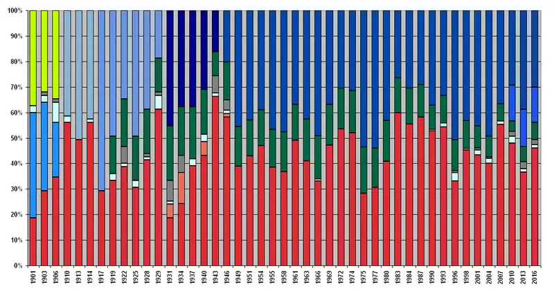 | 21 August 1943 election | 49.9% | 23.0% | 27.1% | 58.2% | 41.8% | 49 | 19 | 6 | 74 |