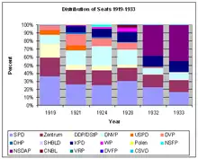 The Free State of Prussia held elections to its Landtag between 1918 and 1933. From 1919 through 1928, these elections gave a plurality to the SPD. In 1932 and 1933, the NSDAP (Nazi Party) won pluralities, generally in line with the rest of Germany.[1][2]