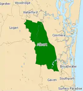 Albert was named for the Albert River, which runs through the electorate and separates Logan City from City of Gold Coast. It was first created in a redistribution in 1887 ahead of the 1888 colonial election and continued to exist (with various boundary alterations) until 1949, when the Darlington and Southport electorates were created. In 1959, the electorate was established again. The 1971 and 1977 redistributions greatly reduced the area of the electorate and minor changes were made in 1991, including the loss of Carbrook in the north and coastal areas below Paradise Point in the south.[1]