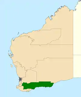 In its current incarnation, Roe includes portions of four regions of Western Australia – the South West, the Wheatbelt, the Great Southern and Goldfields-Esperance. There are eighteen local government areas that fall into the district: Broomehill-Tambellup, Cranbrook, Cuballing, Dumbleyung, Esperance, Gnowangerup, Katanning, Kent, Kojonup, Kulin, Lake Grace, Narrogin, Ravensthorpe, Wagin, West Arthur, Wickepin, Williams and Woodanilling.[2]