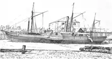 The Monarch was the first ship to be permanently fitted out as a cable ship and operated on a full-time basis by a cable company, although the fitting out for the Netherlands cables was considered temporary.[35] She was a paddle steamer built in 1830 at Thornton-on-Tees with a 130 hp engine.[36] She was the first of a series of cable ships named Monarch.[37]